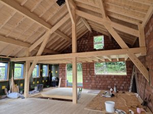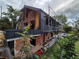 La construction repose principalement sur l’utilisation de briques monomur, avec une isolation extérieure en laine de bois. Les planchers et la charpente seront également en bois, tout comme la façade sud de l’étage, qui sera en porte-à-faux. L’objectif principal de ce projet était de viser une construction proche des performances passives.