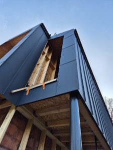 Pour atteindre cet objectif, l’épaisseur des briques et l’isolation extérieure ont été optimisés de manière à obtenir une résistance thermique similaire à celle d’un bâtiment passif. Les murs périphériques seront partiellement recouverts de bardage en bois et d’enduits de ton pierre. La toiture sera réalisée en joint debout, avec une teinte ardoise. Les façades sud et nord de l’étage seront également habillées de bardage en joint debout afin de créer une continuité esthétique avec la couverture.